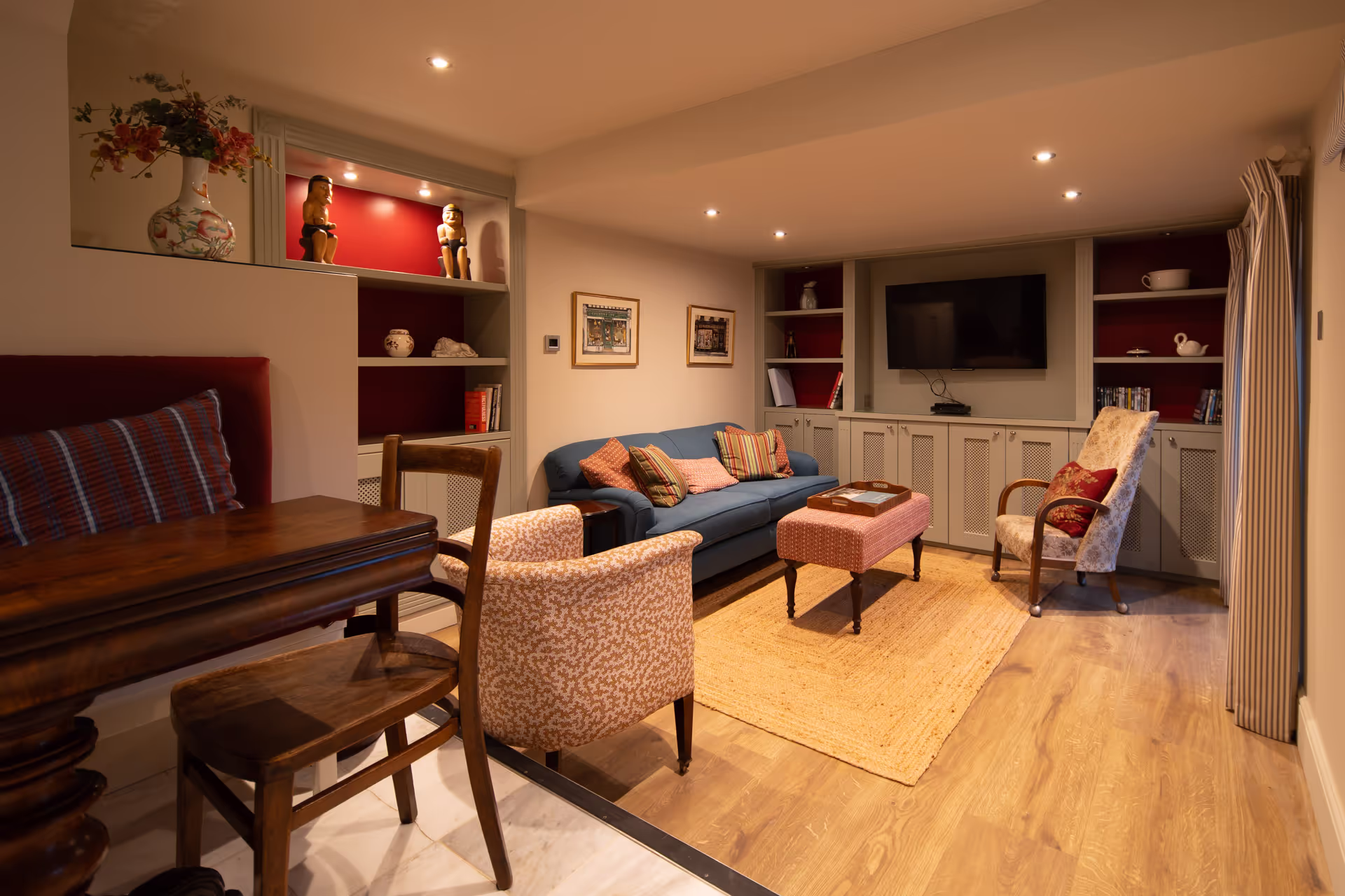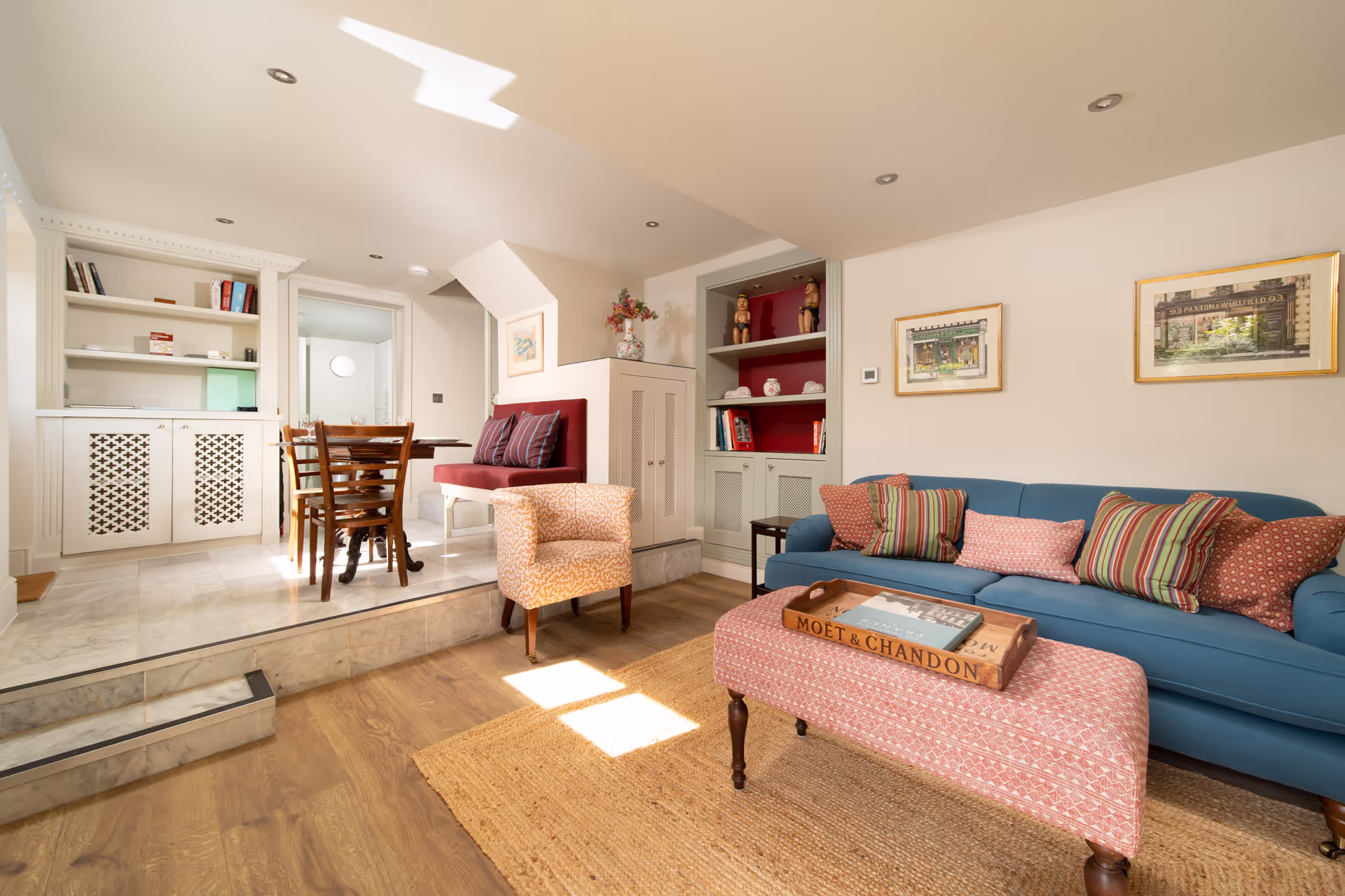 From the entrance, two steps to your right take you down into the living area where you will find a smart TV, two comfortable chairs and a sofa along with a selection of books. To the front of the living room there are double doors leading out to the cottage’s private garden.