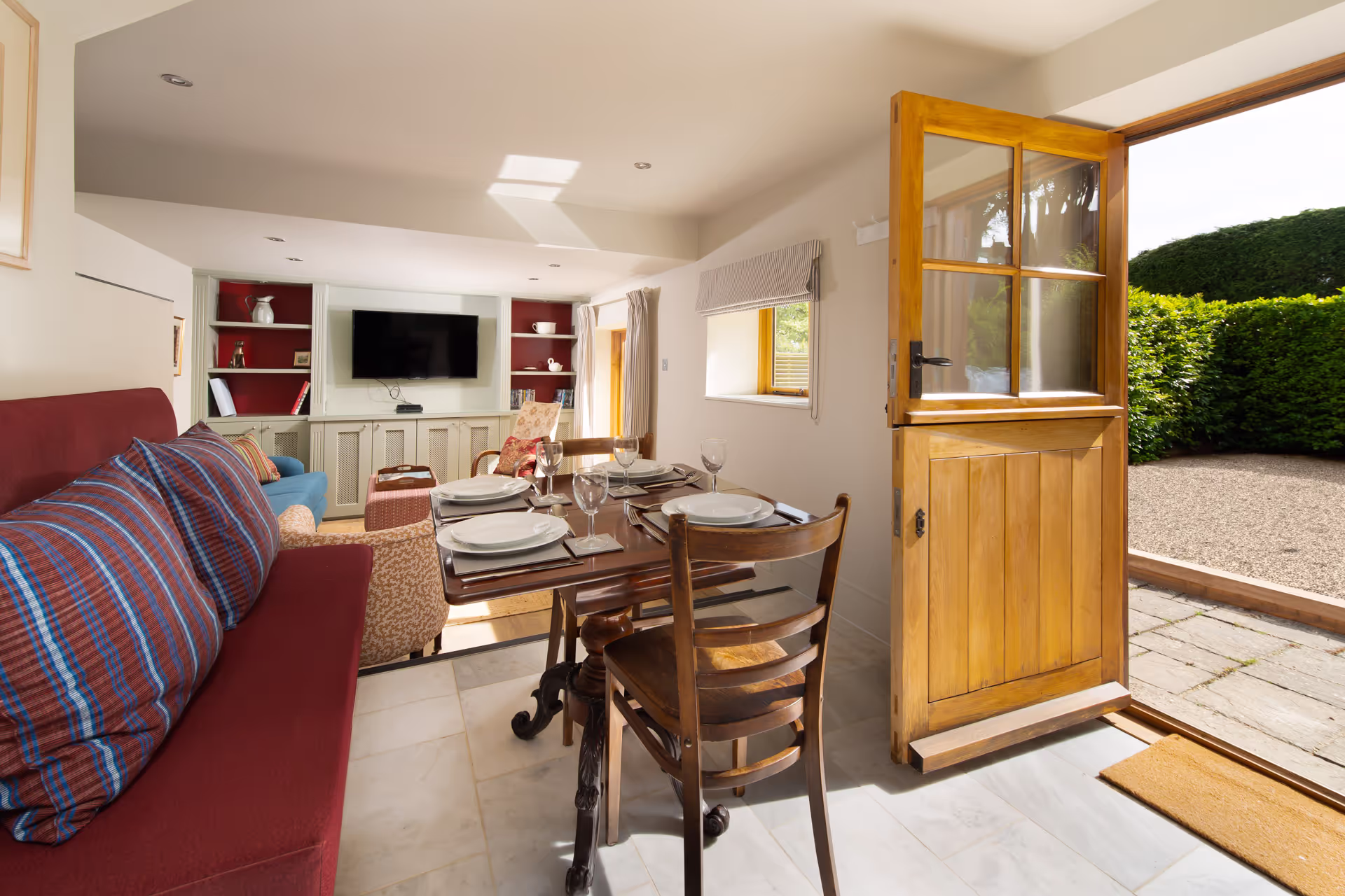 Guests enter this beautiful holiday home through the stable-style door and are welcomed into a character dining area. The dining area features a convertible table with enough space to comfortably seat four when extended, and when stowed in its smaller form, the table is ideal for breakfasts or romantic dinners for two.