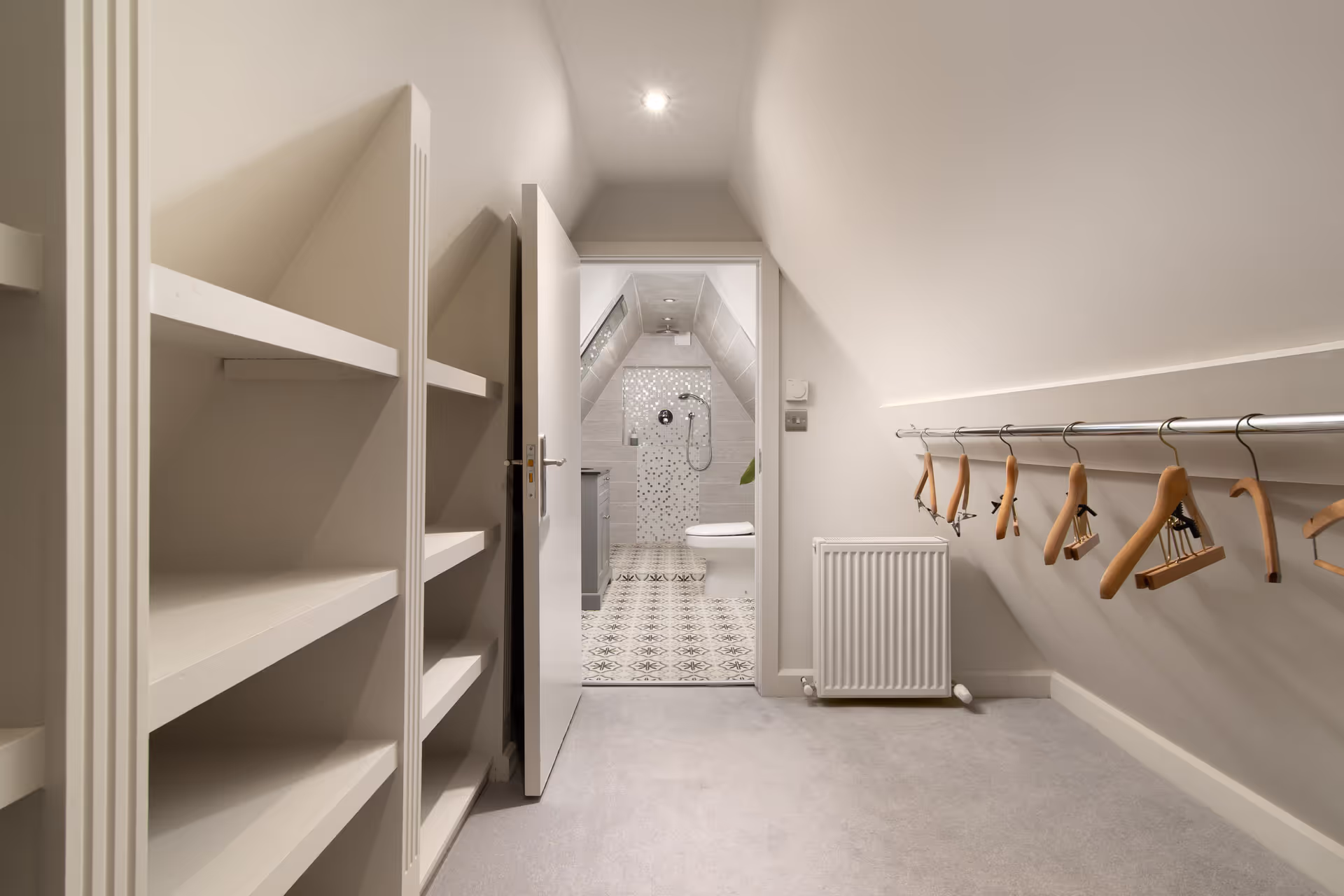 A large walk-in closet separates the bedroom from the en-suite bathroom, which is styled as a wetroom with a large shower area complete with twin shower heads, a wash basin and a WC.